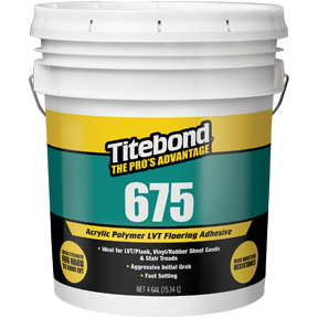 Titebond 675 is a low odor acrylic polymer adhesive designed to produce a strong tenacious bond to oily or highly plasticized LVT products. Titebond 675 provides a strong and permanent bond on heavy traffic areas including commercial, institutional and industrial installations. It may be used for indoor installations over standard c...